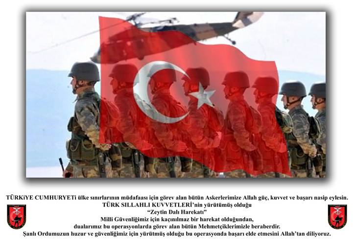 TÜRK SILLAHLI KUVVETLERİ’nin yürütümüş olduğu “Zeytin Dalı Harekatı” Milli Güvenliğimiz için kaçınılmaz bir harekat olduğundan, dualarımız bu operasyonlarda görev alan bütün Mehmetçiklerimizle beraberdir.